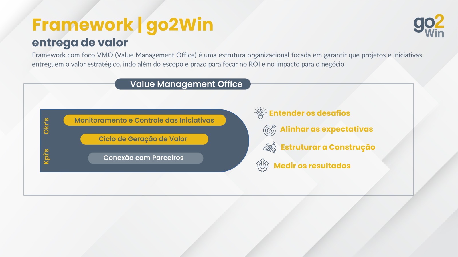 Framework com foco VMO (Value Management Office) é uma estrutura organizacional focada em garantir que projetos e iniciativas entreguem o valor estratégico, indo além do escopo e prazo para focar no ROI e no impacto para o negócio.